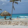 Aruba island in the Caribbean. Several beach huts and palm trees give some shadow. And you may have comfortable swimming and snorkeling in water. There is also notable